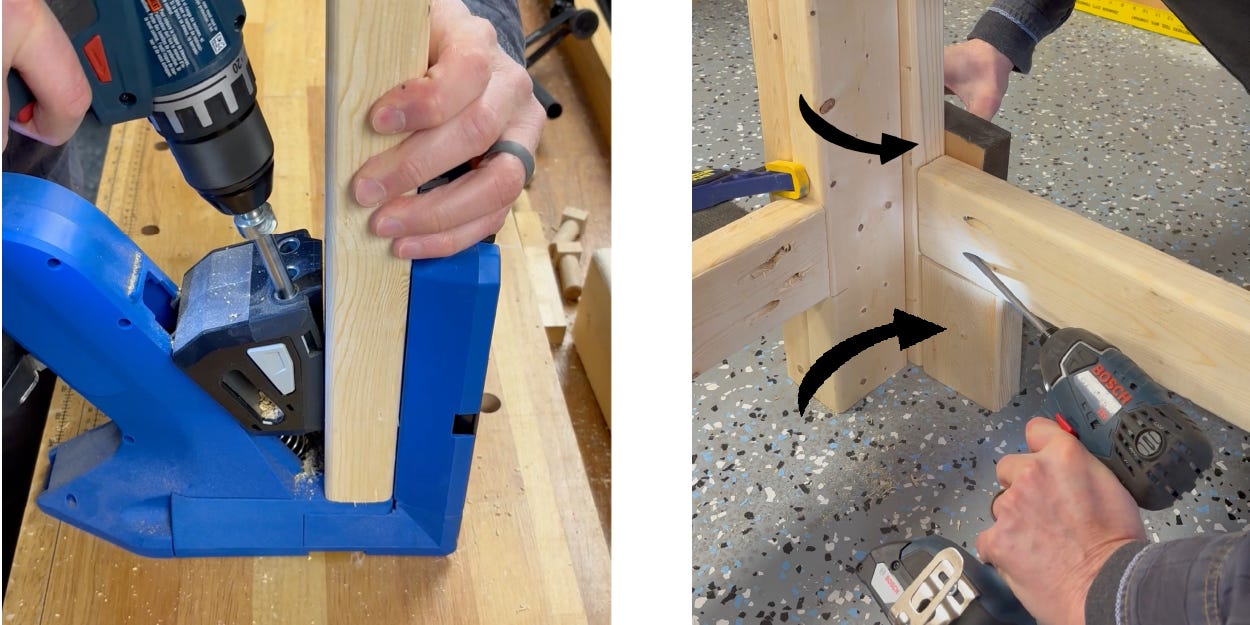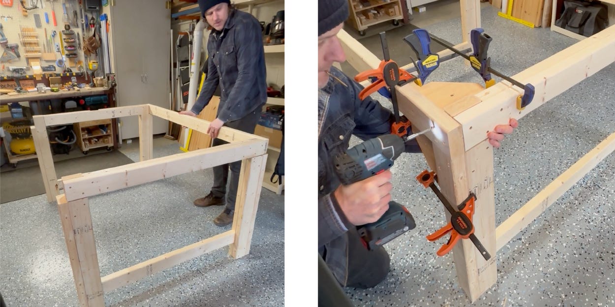 I used the same principle for the cross braces, clamping a board underneath the laterals so the braces could rest in place while attaching them. No need for toeing pocket holes here. You can drive them straight through the side.