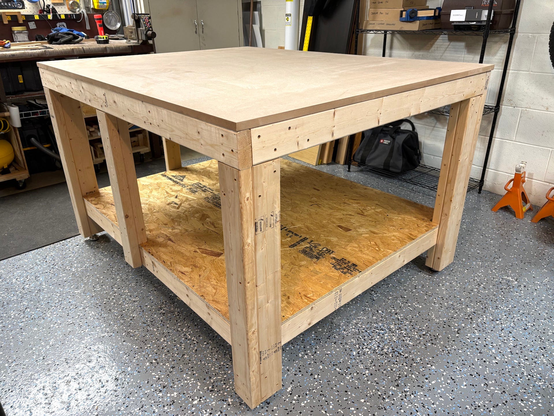 4’x5’ is the biggest table I could fit in my single car garage space. If you have room for it, this could easily be extended to 4’x8’ by leaving the cross members longer and adding another perpendicular cross brace or two. In that case, I would also recommend one additional leg in the center of the 8’ sides to avoid sagging over time.