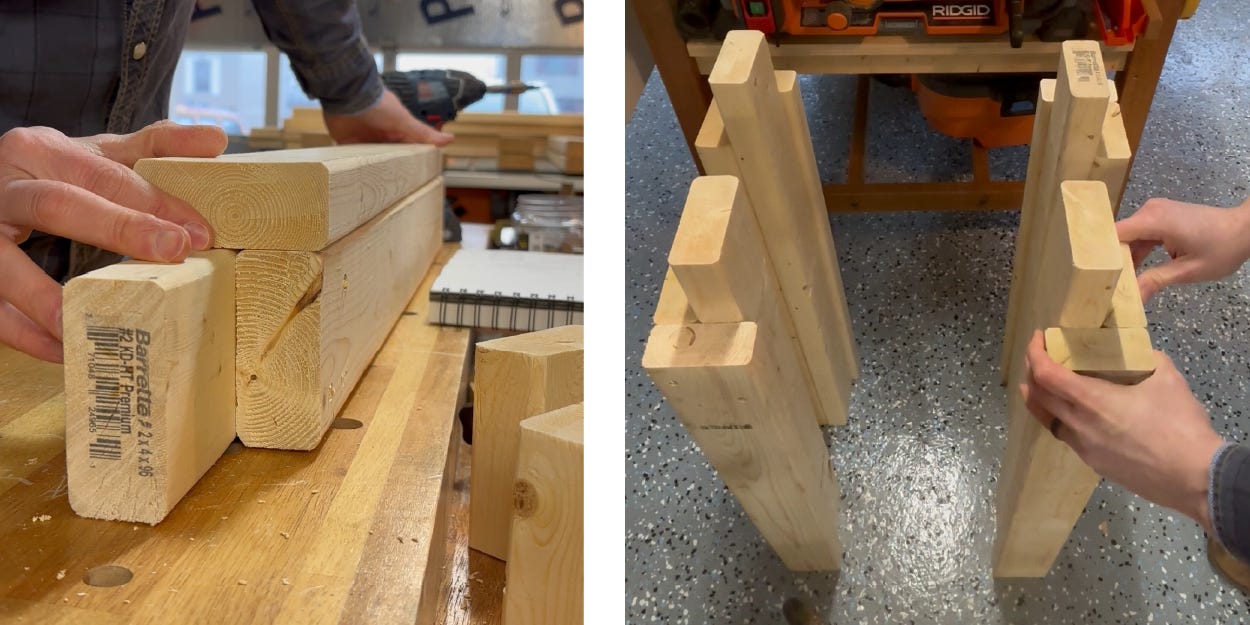 It starts with the legs, which are just three pieces of lumber screwed together with one of them turned 90 degrees. The inner most piece extends 3.5 inches above the other two. This protrusion is where I attached the cross braces.